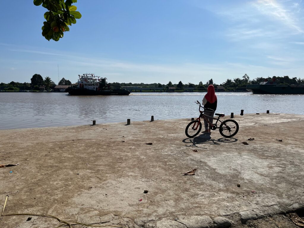 Di momen liburan kemarin, aku belajar naik sepeda sama Umi dan Aba. Aku dipinjami sepeda milik sepupu. Agak canggung sih, karena ini ‘kan sebetulnya sepeda untuk anak laki-laki. Tapi tak apa, kata Aba kalau nanti Aba ada rejeki, aku akan dibelikan sepeda. Alhamdulillah, sekarang aku sudah agak lancar. Aba mengajakku pergi ke pelabuhan kapal motor di tepi sungai. Jaraknya cukup jauh dari rumah Eyang, mungkin supaya aku semakin berani.